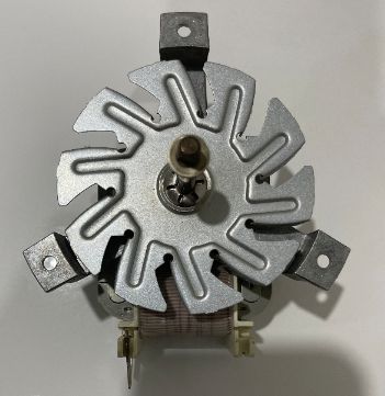 Fan motor assembly (mounted in the rear of the oven, behind the fan cover for circulating the heat from the circular fan element) for the following oven models. Shaft length forward of the mounting tripod 28mm, 30 watt motor.