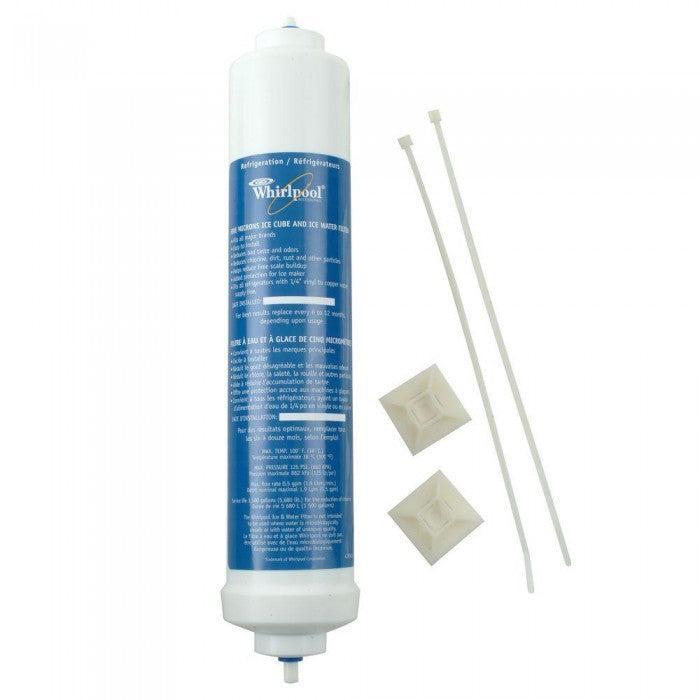 Whirlpool Universal Inline Water Filter (4378411) This filter has quick disconnect couplings only. Benefits of the Universal inline charcoal-style ice and water filter: easy to install, added protection for icemaker, includes easy-to-install push-on connectors and instructions. Removes: lime scale buildup, bad tastes, odours, chlorine, dirt, rust, reduces sediment and other particles to five microns. Universal inline charcoal-style ice and water filter should be replaced: Every 6 months