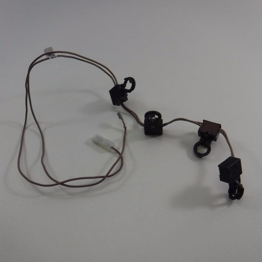 Ignition switches (4) with wiring loom and plug for the gas ignition on some Rangemaster & Leisure oven models. The switches clip onto the back of each gas tap and the connector plugs into the ignition transformer.