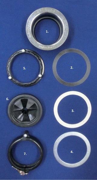 Flange kit for Robinhood and F&P wastemaster garbage disposal units (garbage gobblers or scrapeaters), kit comprises all the parts as pictured: new flange, rubber gasket, fibre gasket, mounting ring with hinged clamp.