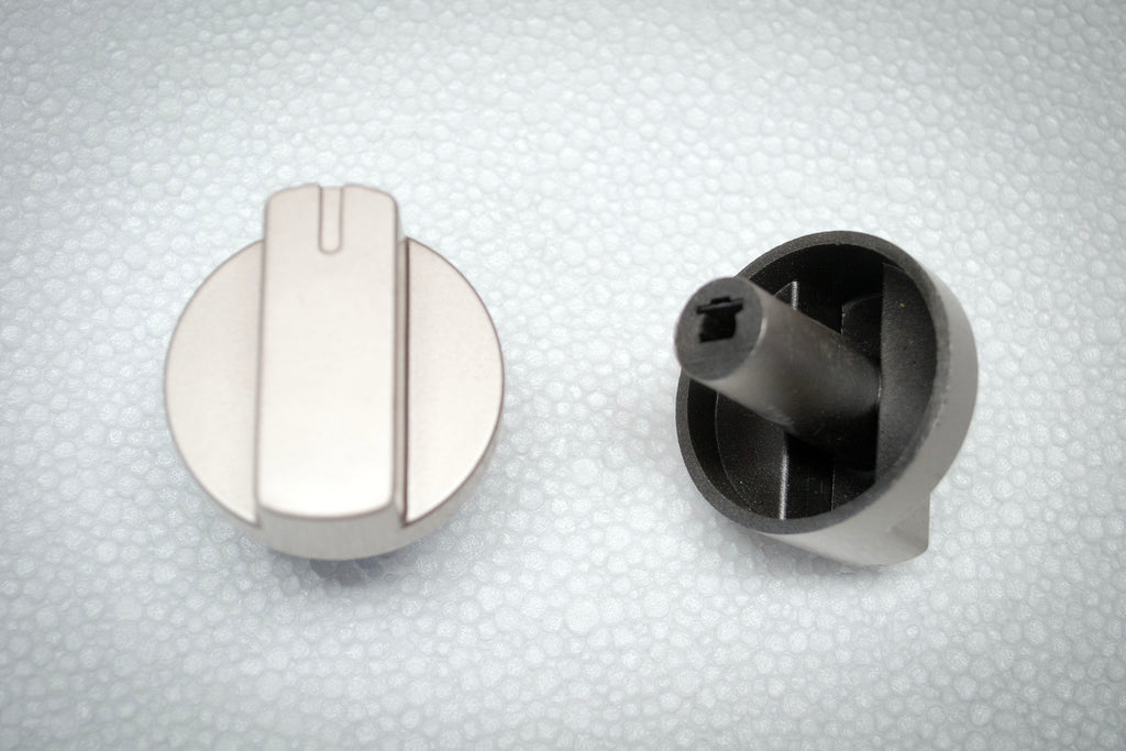 Oven control knob for some makes & models. Knob diameter 46mm, length 45mm, shaft protrudes 23mm, 6mm shaft size. Choose metal or plastic version, cosmetically and physically they are different - body of plastic knob is 25mm high, metal 32mm. For models: