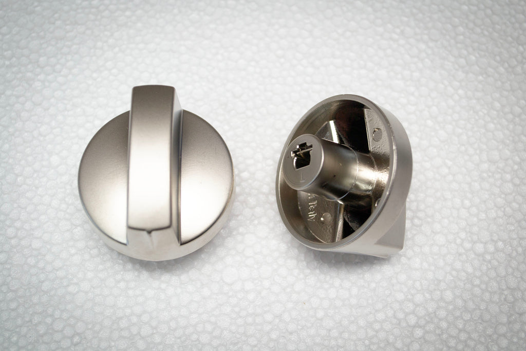 Oven control knob, silver plastic made in Italy, for some makes & models. Knob diameter 46mm, length 45mm, shaft protrudes 23mm. For models: EUROTECH: PARMCO: BELLINI: BDFS905X