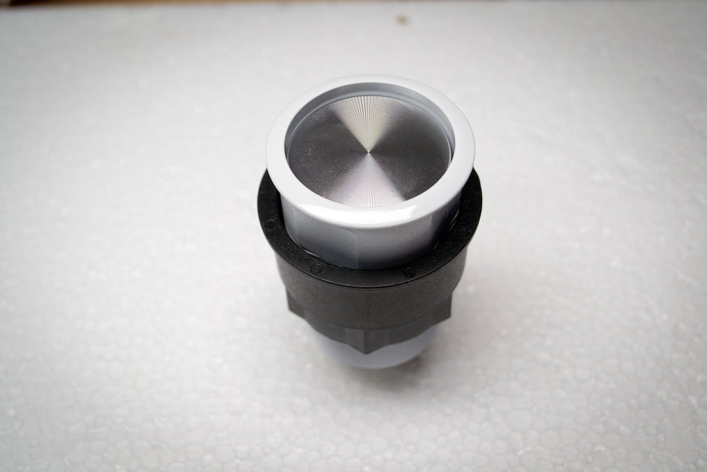 Knob assembly (1), retractable, white surround, for some Vogue & Midea oven models. Consists of brushed chrome knob, threaded knob support plus threaded mounting nut. Knob diameter 33mm, length 45/62mm. Threaded knob support diameter 38mm, 40mm flange. For models: