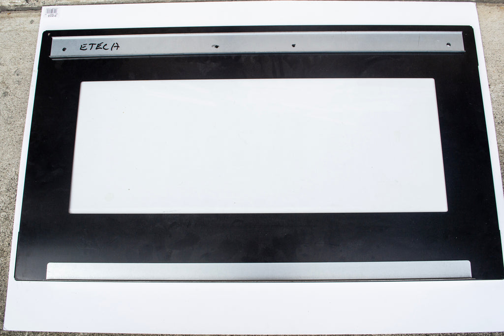 Outer door glass only for some 90cm freestanding ranges, handle is sold separately, 868x494mm, handle drilled 760mm centres. Some versions have slightly different rear brackets but are interchangeable. Panel may be badged Eurotech, Haier or no brand depending on availability: