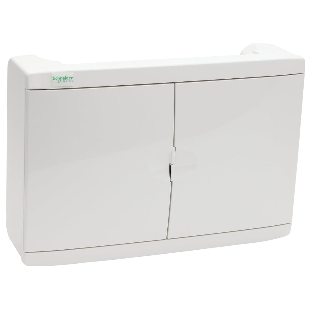 Schneider Resi9 switchboard enclosure, latest version. Surface mounted 15-way distribution board complete with busbars, DIN rail, labels, earth tag and links.